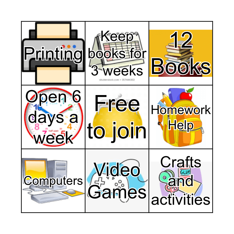 This bingo card has 9 images and 9 words: Computers, 12 Books, Keep books for 3 weeks, Open 6 days a week, Printing, Homework Help, Free to join, Crafts and activities and Video Games.