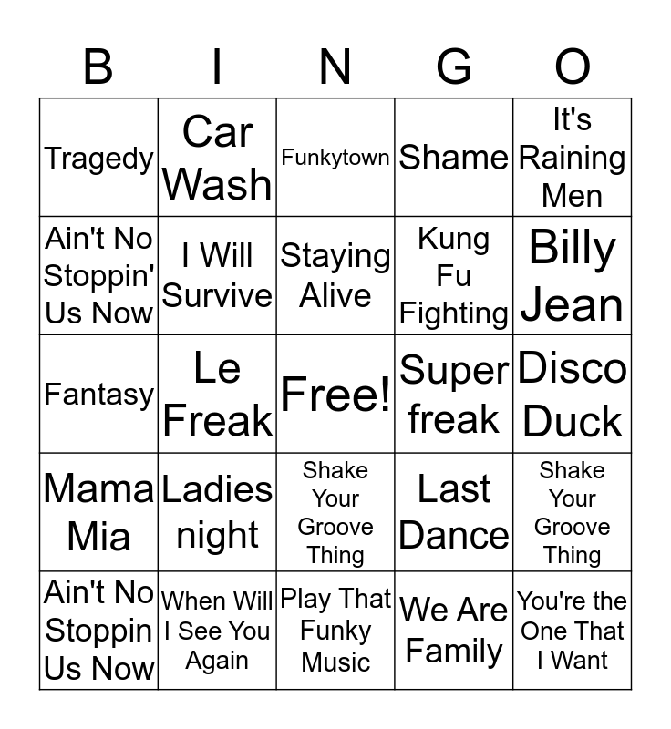 This bingo card has a free space and 34 words: YMCA, We Are Family, Get Down Tonight, Fire, Mama Mia, I Will Survive, It's Raining Men, Ain't No Stoppin Us Now, Car Wash, Oh What A Night, Staying Alive, Funkytown, What A Feeling, Boogie Oogie Oogie, Super freak, Billy Jean, When Will I See You Again, Fantasy, Ladies night, Last Dance, Shake Your Groove Thing, In The Navy, Tragedy, Disco Duck, Play That Funky Music, You're the One That I Want, Shame, Knock on Wood, Kung Fu Fighting, Ain't No Stoppin' Us Now, Rock The Boat, Le Freak, Shake Your Groove Thing and Never Can Say Goodbye.
