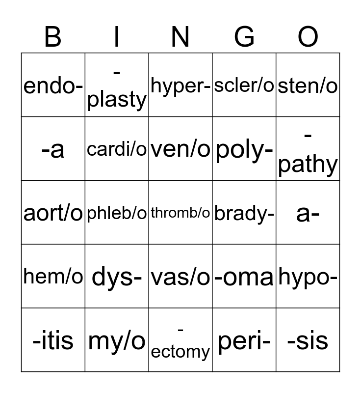 This bingo card has 40 words: angi/o, aort/o, atri/o, cardi/o, my/o, vas/o, ven/o, cyan/o, sten/o, hem/o, phleb/o, scler/o, thromb/o, a-, brady-, dys-, tachy-, endo-, epi-, hyper-, hypo-, peri-, poly-, -a, -algia, -genic, -ia, -plegia, -sis, -spasm, -emia, -itis, -megaly, -oma, -pathy, -ectomy, -gram, -lytic, -plasty and -stomy.