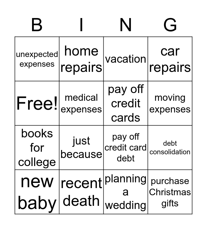 This bingo card has 16 words: recent death, debt consolidation, vacation, unexpected expenses, books for college, home repairs, pay off credit card debt, planning a wedding, Free!, medical expenses, new baby, car repairs, just because, moving expenses, pay off credit cards and purchase Christmas gifts.