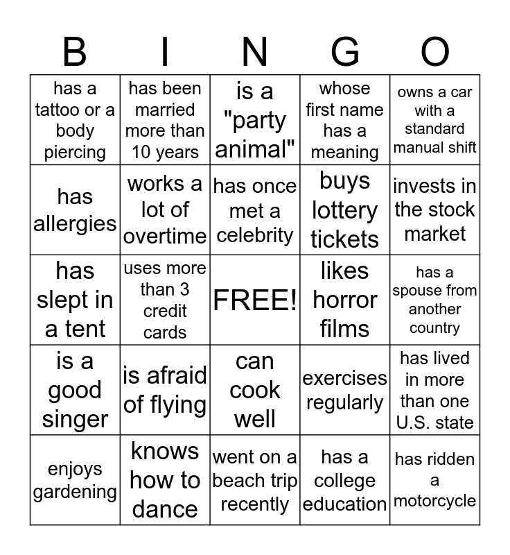 This bingo card has a free space and 24 words: is afraid of flying, knows how to dance, has once met a celebrity, enjoys gardening, owns a car with a standard manual shift, has a tattoo or a body piercing, has allergies, has been married more than 10 years, likes horror films, can cook well, buys lottery tickets, has slept in a tent, exercises regularly, has lived in more than one U.S. state, works a lot of overtime, has a college education, has a spouse from another country, is a "party animal", invests in the stock market, uses more than 3 credit cards, has ridden a motorcycle, is a good singer, whose first name has a meaning and went on a beach trip recently.