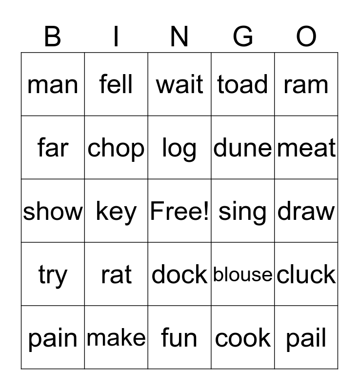 This bingo card has a free space and 24 words: rat, make, log, pain, ram, man, far, fell, sing, dock, dune, show, blouse, cluck, chop, cook, draw, wait, meat, key, pail, try, toad and fun.