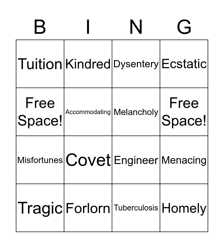 This bingo card has 16 words: Forlorn, Menacing, Dysentery, Tuition, Misfortunes, Kindred, Engineer, Tuberculosis, Free Space!, Accommodating, Tragic, Ecstatic, Covet, Free Space!, Melancholy and Homely.