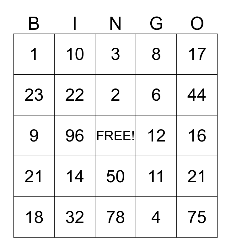 This bingo card has a free space and 24 words: 14, 32, 2, 18, 17, 1, 23, 10, 12, 50, 6, 9, 11, 21, 22, 4, 16, 3, 44, 96, 75, 21, 8 and 78.