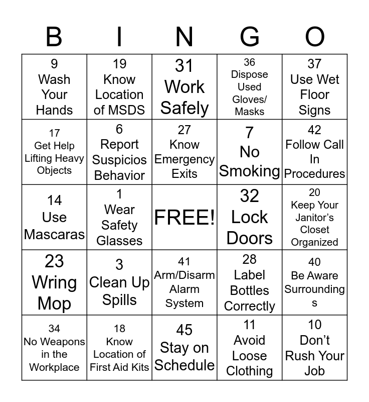 This bingo card has a free space and 24 words: 3 Clean Up Spills, 18 Know Location of First Aid Kits, 27 Know Emergency Exits, 34 No Weapons in the Workplace, 37 Use Wet Floor Signs, 9 Wash Your Hands, 17 Get Help Lifting Heavy Objects, 19 Know Location of MSDS, 32 Lock Doors, 41 Arm/Disarm Alarm System, 7 No Smoking, 14 Use Mascaras, 28 Label Bottles Correctly, 40 Be Aware Surrounding s, 6 Report Suspicios Behavior, 11 Avoid Loose Clothing, 20 Keep Your Janitor’s Closet Organized, 31 Work Safely, 42 Follow Call In Procedures, 1 Wear Safety Glasses, 10 Don’t Rush Your Job, 23 Wring Mop, 36 Dispose Used Gloves/ Masks and 45 Stay on Schedule.