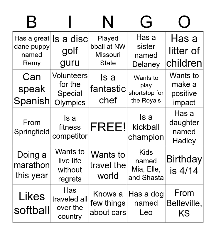 This bingo card has a free space and 24 words: Wants to live life without regrets, Has traveled all over the country, Is a fantastic chef, Likes softball, Has a litter of children, Has a great dane puppy named Remy, Can speak Spanish, Is a disc golf guru, Is a kickball champion, Wants to travel the world, Wants to play shortstop for the Royals, From Springfield, Kids named Mia, Elle, and Shasta, Birthday is 4/14, Volunteers for the Special Olympics, Has a dog named Leo, Has a daughter named Hadley, Played bball at NW Missouri State, Wants to make a positive impact, Is a fitness competitor, From Belleville, KS, Doing a marathon this year, Has a sister named Delaney and Knows a few things about cars.
