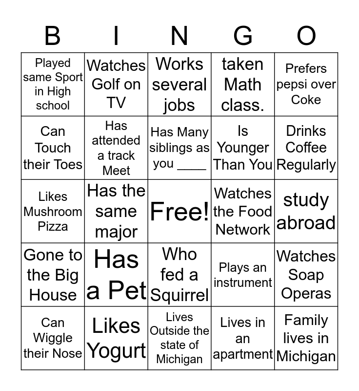 This bingo card has a free space and 24 words: Has a Pet, Likes Yogurt, Has Many siblings as you ____, Can Wiggle their Nose, Prefers pepsi over Coke, Played same Sport in High school, Can Touch their Toes, Watches Golf on TV, Watches the Food Network, Who fed a Squirrel, Is Younger Than You, Likes Mushroom Pizza, Plays an instrument, Watches Soap Operas, Has attended a track Meet, Lives in an apartment, study abroad, Works several jobs, Drinks Coffee Regularly, Has the same major, Family lives in Michigan, Gone to the Big House, taken Math class. and Lives Outside the state of Michigan.