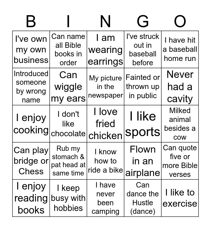 This bingo card has 65 words: Can play a musical instrument, I've jumped out of an airplane before, I've milked a cow, Can quote five or more Bible verses, I can speak a foreign language, I've visited another continent, Can name all Bible books in order, I like to write (or read) poetry, My picture in the newspaper, Speeding or parking ticket, I know how to ride a bike, Shaken a famous person's hand, Milked animal besides a cow, I have hit a baseball home run, Enjoy opera music, Introduced someone by wrong name, I don't like chocolate, I've own my own business, I taught Sunday School, Fainted or thrown up in public, Rub my stomach & pat head at same time, Can play bridge or Chess, I've struck out in baseball before, I've bake homemade bread before, I've been on a mission trip, Youngest child in my family, Ridden a horse, Have my own cell phone, I love fried chicken, Practice coping skills regularly, I enjoy reading books, Help keep kitchen & dining area clean, I know how to send an e-mail, Like learning about health topics, Flown in an airplane, I keep busy with hobbies, I was born in Nebraska, I enjoy cooking, Can dance the Hustle (dance), Enjoy attending religious ceremonies, Can wiggle my ears, I like to journal, I like sports, Never traveled to another state, Wore braces on my teeth, I can whistle a song, Never had a cavity, Slept in a tent when camping, I like to exercise, Can write my name backwards, I've lied about my age, I have had stitches, Attended professional baseball game, I have never been camping, I am afraid of spiders, Visited another country, Never been skydiving, I am wearing earrings, Met someone famous, Laughed so hard I wet myself, Drove to Canada more than once, Locked keys in a car, I have polished toe nails, I like sushi and Can do a split.