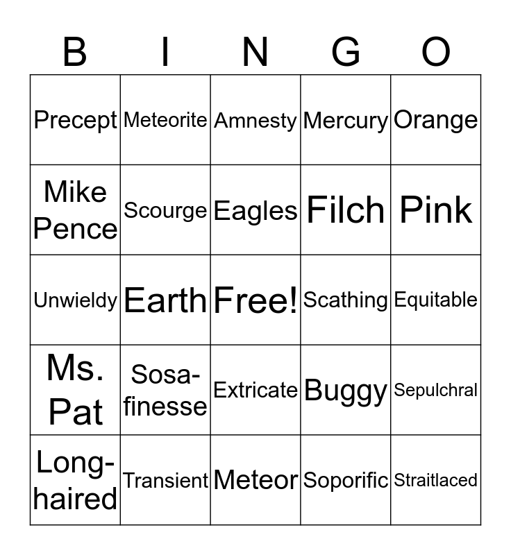 This bingo card has a free space and 24 words: Sosa-finesse, Transient, Eagles, Long-haired, Orange, Precept, Mike Pence, Meteorite, Scathing, Extricate, Filch, Unwieldy, Buggy, Sepulchral, Scourge, Soporific, Equitable, Amnesty, Pink, Earth, Straitlaced, Ms. Pat, Mercury and Meteor.