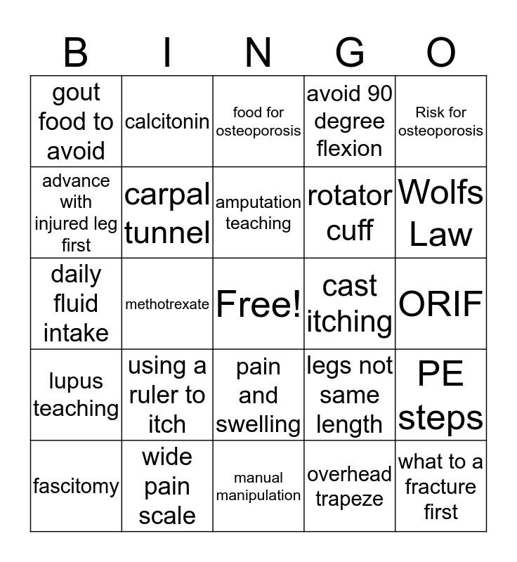 This bingo card has a free space and 59 words: muscle relaxant, wide pain scale, goal of orthopedic nursing, lupus teaching, overhead trapeze, RA Pain, carpal tunnel, bucks traction, rotator cuff, stay upright for 30 minutes, avoid 90 degree flexion, OA cream, advance with injured leg first, C-reactive protein, weight on floor, gout food to avoid, what to a fracture first, Risk for osteoporosis, abductor pillow log roll, amputation teaching, cast itching, food for osteoporosis, fascitomy, PE steps, teach hip replacement, phalen test, R.I.C.E, PCA OD, Wolfs Law, TRACTION, Cast difference, RA Medication, tinel test, compartment syndrome, calcitonin, avoid sun, inflammation synovial tissue, methotrexate, Lovenox, daily fluid intake, sitting in high stools, using a ruler to itch, ORIF, Skeletal traction, arthrocntesis, arthroscopy, pain, promote self care, pain and swelling, manual manipulation, surgical intervention, 6 P's, pain unrelieved, osteomyelitis, bone death, legs not same length, lift object by bendning, swan neck and bone graft.