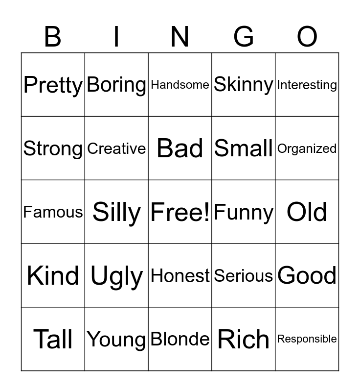 This bingo card has a free space and 29 words: Tall, Short, Silly, Intelligent, Pretty, Handsome, Creative, Ugly, Funny, Young, Old, Responsible, Blonde, Rich, Organized, Artistic, Honest, Kind, Interesting, Famous, Serious, Shy, Small, Strong, Skinny, Boring, Good, Bad and Old.