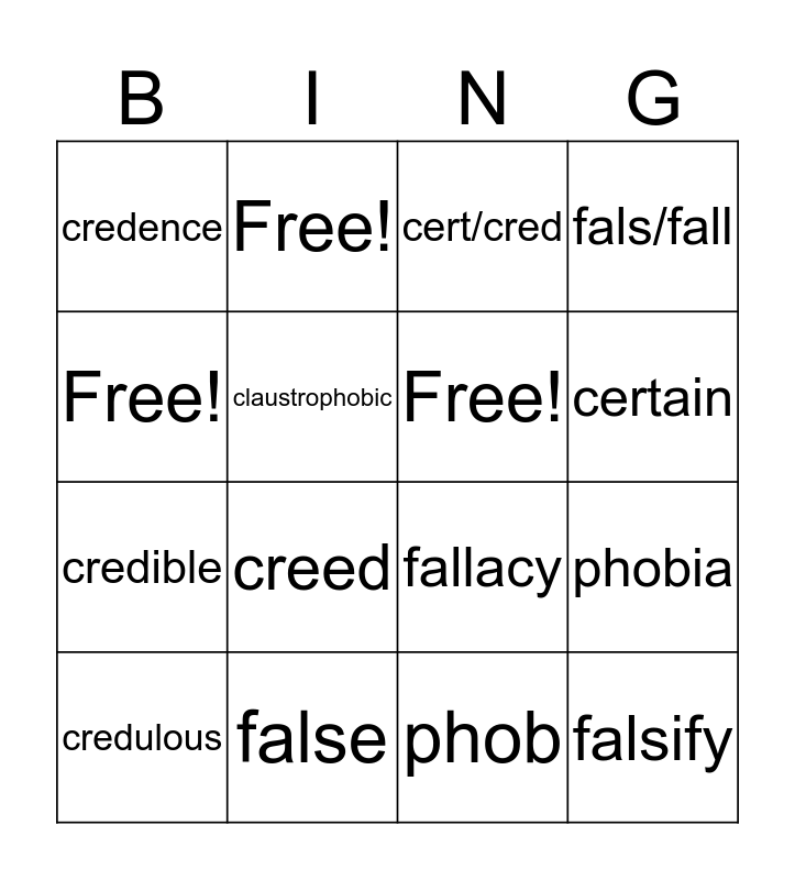 This bingo card has 16 words: false, phobia, cert/cred, credence, credible, Free!, fallacy, phob, Free!, claustrophobic, credulous, fals/fall, creed, certain, Free! and falsify.