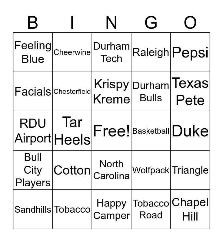 This bingo card has a free space and 38 words: Coastal Plain, Mt. Olive Pickles, UNC, Chesterfield, Triangle, Cotton, Krispy Kreme, United States, Pepsi, Durham Bulls, Tar Heels, Raleigh, Chapel Hill, Duke, Facials, Bull City Players, Piedmont, Durham Tech, Blue Devils, Basketball, Feeling Blue, Tobacco, Texas Pete, Sandhills, Blue Ridge, Happy Camper, Durham, Zumba, Carolina Hurricanes, Hogs, NCSU, North Carolina, Tobacco Road, Cheerwine, Get the Ball Rolling, Wolfpack, RDU Airport and Mountains.