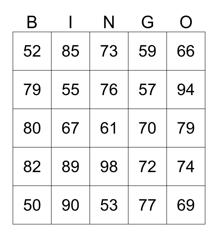 This bingo card has a free space and 55 words: 49, 50, 51, 52, 53, 54, 55, 56, 57, 58, 59, 60, 62, 63, 64, 65, 66, 67, 68, 69, 70, 71, 72, 73, 75, 76, 77, 78, 79, 74, 75, 76, 77, 78, 79, 80, 81, 82, 83, 84, 85, 86, 87, 88, 89, 90, 91, 92, 93, 94, 95, 96, 97, 98 and 99.