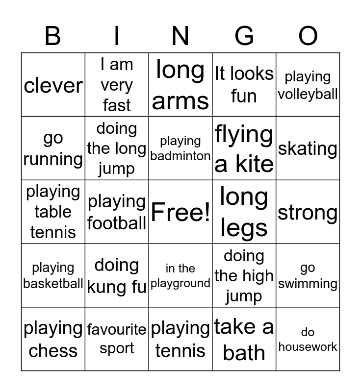 This bingo card has a free space and 24 words: playing chess, doing kung fu, playing badminton, take a bath, playing volleyball, clever, I am very fast, long arms, long legs, strong, playing table tennis, doing the long jump, doing the high jump, go swimming, go running, favourite sport, playing tennis, It looks fun, skating, playing basketball, playing football, in the playground, flying a kite and do housework.