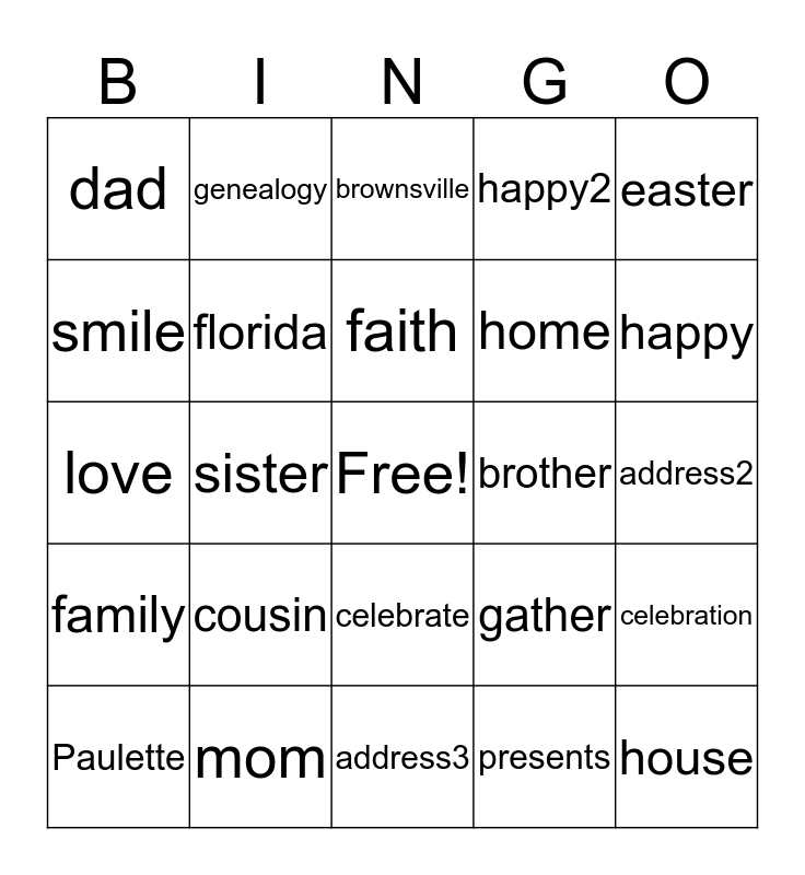 This bingo card has a free space and 29 words: Paulette, address, sister, twin, dad, brownsville, florida, cousin, brother, mom, address2, house, address3, presents, happy, claudette, celebrate, family, easter, love, gather, address4, home, smile, happy2, genealogy, celebration, faith and hope.
