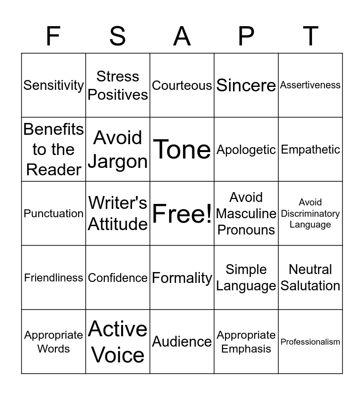 This bingo card has a free space and 24 words: Confidence, Active Voice, Tone, Appropriate Words, Assertiveness, Sensitivity, Benefits to the Reader, Stress Positives, Avoid Masculine Pronouns, Formality, Apologetic, Punctuation, Simple Language, Neutral Salutation, Avoid Jargon, Appropriate Emphasis, Avoid Discriminatory Language, Courteous, Empathetic, Writer's Attitude, Professionalism, Friendliness, Sincere and Audience.