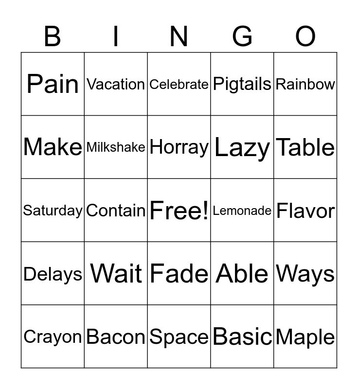 This bingo card has a free space and 24 words: Wait, Bacon, Horray, Crayon, Rainbow, Pain, Make, Vacation, Lemonade, Fade, Lazy, Saturday, Able, Ways, Milkshake, Basic, Flavor, Celebrate, Table, Contain, Maple, Delays, Pigtails and Space.