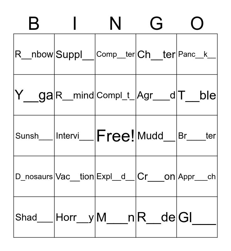This bingo card has a free space and 24 words: Shad___, Vac__tion, Compl_t_, R__de, Panc__k__, R__nbow, Suppl__, Comp__ter, Mudd__, Br____ter, Sunsh___, R__mind, Cr___on, Appr___ch, Y__ga, Horr__y, M___n, Ch__ter, T__ble, D_nosaurs, Intervi___, Expl__d__, Agr___d and Gl___.