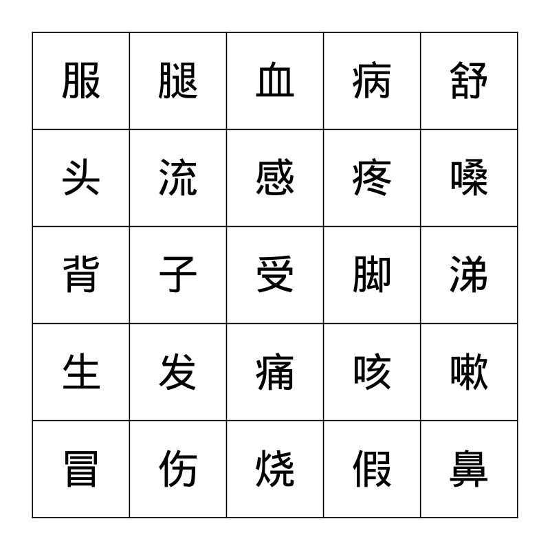 This bingo card has 25 words: 发, 烧, 感, 冒, 舒, 服, 头, 腿, 脚, 痛, 疼, 背, 咳, 嗽, 流, 鼻, 涕, 血, 嗓, 子, 受, 伤, 生, 病 and 假.
