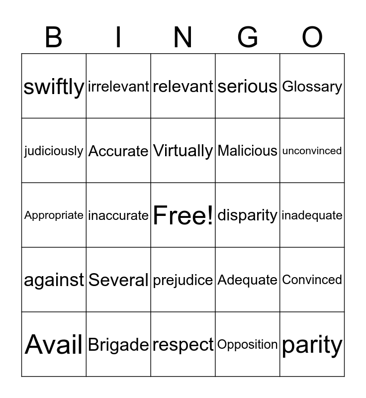 This bingo card has a free space and 24 words: Several, Brigade, Virtually, Avail, Glossary, swiftly, judiciously, irrelevant, disparity, prejudice, Malicious, Appropriate, Adequate, Convinced, Accurate, Opposition, inadequate, relevant, unconvinced, inaccurate, parity, against, serious and respect.