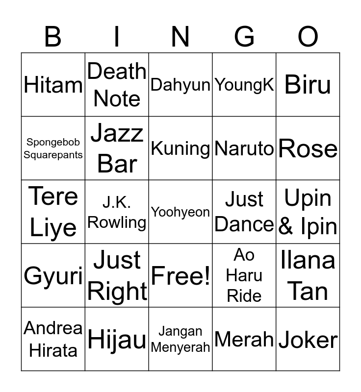 This bingo card has 26 words: Free!, Merah, Kuning, Hijau, Biru, Hitam, Spongebob Squarepants, Death Note, Upin & Ipin, Ao Haru Ride, Naruto, Tere Liye, Ilana Tan, Andrea Hirata, J.K. Rowling, Asma Nadia, YoungK, Gyuri, Dahyun, Yoohyeon, Rose, Jangan Menyerah, Just Dance, Just Right, Jazz Bar and Joker.