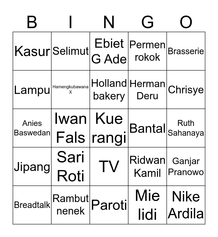This bingo card has 25 words: Sari Roti, Paroti, Holland bakery, Breadtalk, Brasserie, Kasur, Lampu, Selimut, Bantal, TV, Herman Deru, Anies Baswedan, Ridwan Kamil, Ganjar Pranowo, Hamengkubawana X, Nike Ardila, Ruth Sahanaya, Ebiet G Ade, Chrisye, Iwan Fals, Kue rangi, Rambut nenek, Jipang, Permen rokok and Mie lidi.