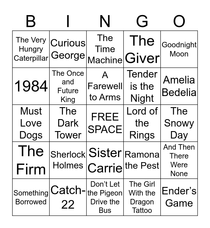 This bingo card has a free space and 75 words: The Call of the Wild, Ragtime, A Farewell to Arms, Heart of Darkness, The Catcher in the Rye, From Here to Eternity, Death Comes for the Archbishop, The Naked and the Dead, Howard’s End, Go Tell it on the Mountain, All the King’s Men, As I Lay Dying, Sister Carrie, Tender is the Night, The Grapes of Wrath, 1984, Catch-22, Sons and Lovers, Dublin, Amelia Bedelia, The Cat in the Hat, Curious George, Don’t Let the Pigeon Drive the Bus, The Giver, Goodnight Moon, Harriet the Spy, Harry Potter, Hatchet, The Hobbit, Jumanji, The Little Prince, Matilda, The Phantom Tollbooth, Ramona the Pest, The Snowy Day, The Very Hungry Caterpillar, Where the Wild Things Are, Winnie the Pooh, Lord of the Rings, Ender’s Game, A Song of Ice and Fire, Brave New World, American Gods, I, Robot, The Name of the Wind, Frankenstein, The Dark Tower, The Time Machine, The War of the Worlds, The Mists of Avalon, The Left Hand of Darkness, The Once and Future King, Contact, Small Gods, I am Legend, Something Wicked This Way Comes, Stranger in a Strange Land, Outlander, Time Traveler’s Wife, Bridget Jones’s Diary, Something Borrowed, The Devil Wears Prada, P.S. I Love You, The Starter Wife, Waiting to Exhale, Must Love Dogs, The Nanny Diaries, The Maltese Falcon, The Spy Who Came in From the Cold, And Then There Were None, The Firm, Sherlock Holmes, Gone Girl, The Girl With the Dragon Tattoo and The Cuckoo’s Calling.