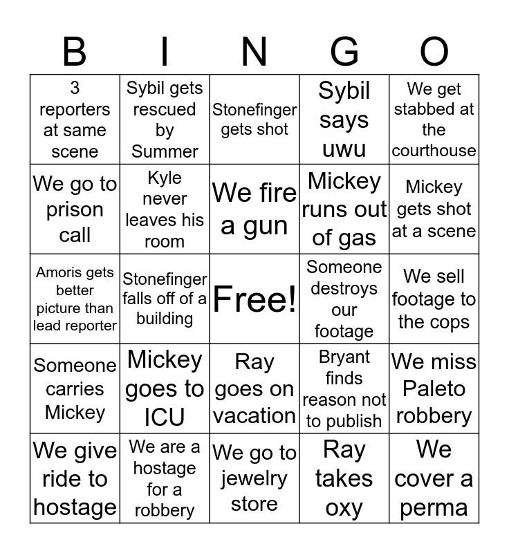 This bingo card has a free space and 24 words: Mickey goes to ICU, We are a hostage for a robbery, We fire a gun, We give ride to hostage, We get stabbed at the courthouse, 3 reporters at same scene, We go to prison call, Sybil gets rescued by Summer, Someone destroys our footage, Ray goes on vacation, Mickey runs out of gas, Amoris gets better picture than lead reporter, Bryant finds reason not to publish, We miss Paleto robbery, Kyle never leaves his room, Ray takes oxy, We sell footage to the cops, Stonefinger gets shot, Mickey gets shot at a scene, Stonefinger falls off of a building, We cover a perma, Someone carries Mickey, Sybil says uwu and We go to jewelry store.