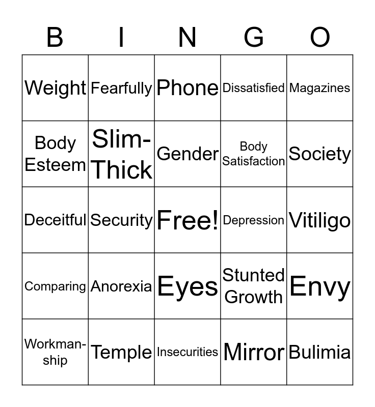 This bingo card has a free space and 36 words: Thigh-gap, Skinny, Madonna, Slim-Thick, Stunted Growth, Comparing, Gender, Self-Esteem, Magazines, Reality, Security, Dissatisfied, Diet, Depression, Society, Weight, Hair, Anorexia, Bulimia, Phone, Vitiligo, Envy, Temple, Workman-ship, Insecurities, Fearfully, Deceitful, Adolescent, Body Satisfaction, Body Esteem, Perception, Fasting, Mirror, Eyes, Binge Eating and Oil Pills.