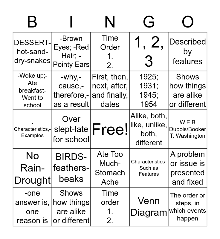 This bingo card has a free space and 29 words: Hurricane-Lost Lives, Shows how things are alike or different, Time Order 1. 2., ?-Answer, Described by features, DESSERT-hot-sand-dry-snakes, -why,-cause,- therefore,- as a result, First, then, next, after, and finally, dates, Alike, both, like, unlike, both, different, A problem or issue is presented and fixed, -one answer is, one reason is, Over slept-late for school, Venn Diagram, The order or steps, in which events happen, -Characteristics,-Examples, -As a result _Effect, Time order 1. 2., Characteristics-Such as Features, Shows how things are alike or different, No Rain-Drought, BIRDS-feathers-beaks, -Puzzle is,--to solve this, 1925; 1931; 1945; 1954, W.E.B Dubois/Booker T. Washington, -Woke up;-Ate breakfast-Went to school, -Brown Eyes; -Red Hair; -Pointy Ears, Ate Too Much-Stomach Ache, 1, 2, 3 and Topic: Same/Different.
