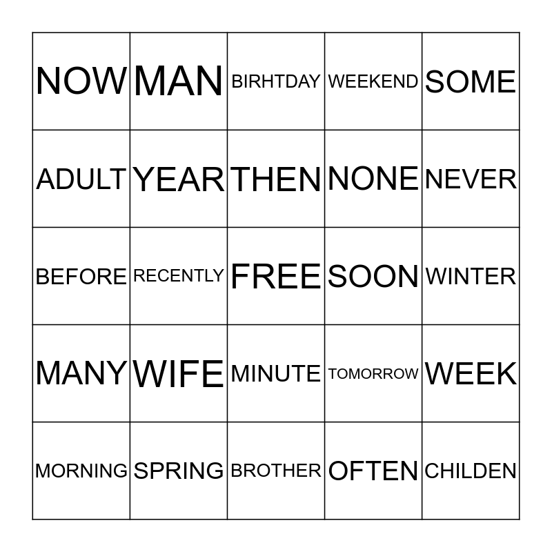 This bingo card has a free space and 47 words: FAMILY, CHILDEN, SISTER, BROTHER, WIFE, HUSBAND, MAN, WOMAN, ADULT, YESTERDAY, YEAR, WEEKEND, WEEK, TOMORROW, TODAY, TIME, THEN, SOON, SOMETIMES, SOME, RECENTLY, OFTEN, NOW, NONE, NIGHT, NEVER, MORNING, MONTH, MINUTE, MANY, LONG TIME AGO, LATER, LATE, HOUR, SUMMER, SPRING, WINTER, FALL, DAILY, EVERY/EACH, DAY, BIRHTDAY, BEFORE, ALWAYS, ALL, AFTER and AFTERNOON.