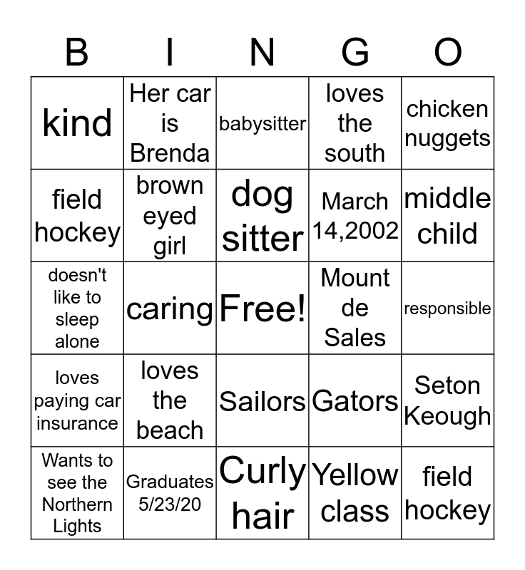 This bingo card has a free space and 29 words: Wants to see the Northern Lights, lifeguard, caring, lacrosse, kind, babysitter, brown eyed girl, loves the beach, Mount de Sales, Graduates 5/23/20, responsible, field hockey, Curly hair, Yellow class, middle child, basketball, Sailors, loves paying car insurance, chicken nuggets, doesn't like to sleep alone, Gators, loyal, March 14,2002, field hockey, loves the south, Her car is Brenda, Seton Keough, dog sitter and Worked at Peace of Pizza.