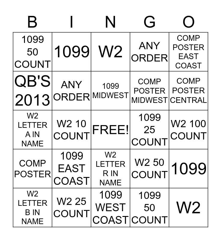 This bingo card has a free space and 24 words: 1099 EAST COAST, W2 25 COUNT, 1099 MIDWEST, W2 LETTER B IN NAME, COMP POSTER EAST COAST, 1099 50 COUNT, QB'S 2013, 1099, 1099 25 COUNT, W2 LETTER R IN NAME, COMP POSTER MIDWEST, W2 LETTER A IN NAME, W2 50 COUNT, 1099, ANY ORDER, 1099 50 COUNT, W2 100 COUNT, W2, COMP POSTER CENTRAL, W2 10 COUNT, W2, COMP POSTER, ANY ORDER and 1099 WEST COAST.