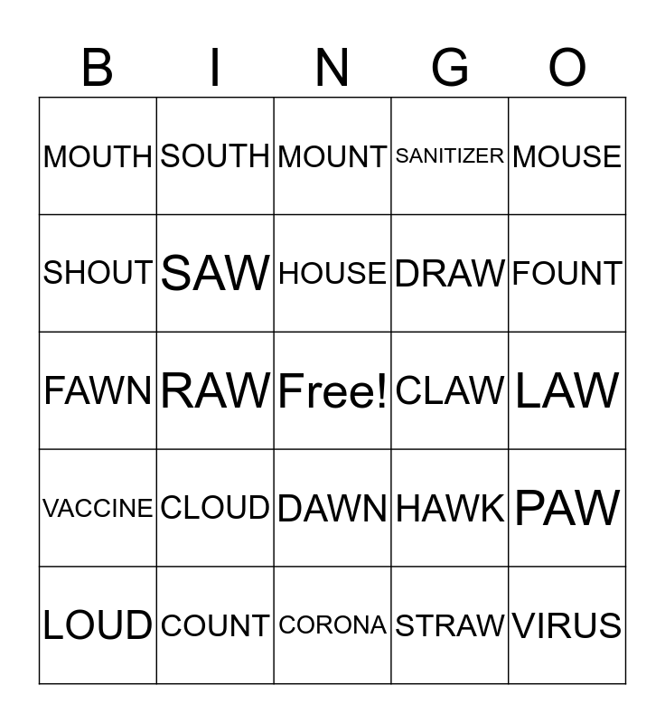 This bingo card has a free space and 24 words: CLOUD, COUNT, HOUSE, LOUD, MOUSE, MOUTH, SHOUT, SOUTH, CLAW, DAWN, DRAW, FAWN, HAWK, PAW, SAW, STRAW, LAW, MOUNT, FOUNT, RAW, VIRUS, VACCINE, SANITIZER and CORONA.