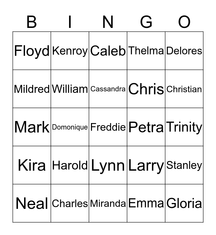 This bingo card has 25 words: Harold, Miranda, Cassandra, Neal, Delores, Floyd, Mildred, Kenroy, Petra, Lynn, Chris, Mark, Larry, Stanley, William, Gloria, Trinity, Caleb, Christian, Domonique, Freddie, Charles, Kira, Thelma and Emma.
