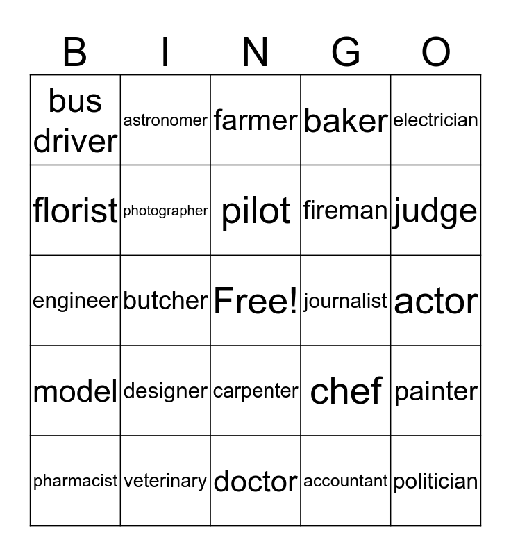 This bingo card has a free space and 46 words: travel agent, veterinary, waiter, accountant, actor, architect, astronomer, author, baker, bricklayer, bus driver, butcher, carpenter, chef, cleaner, dentist, designer, doctor, refuse collector, electrician, engineer, factory worker, farmer, fireman, fisherman, florist, gardener, hairdresser, journalist, judge, lawyer, lecturer, librarian, lifeguard, mechanic, model, newsreader, nurse, optician, painter, pharmacist, photographer, pilot, plumber, politician and policeman.