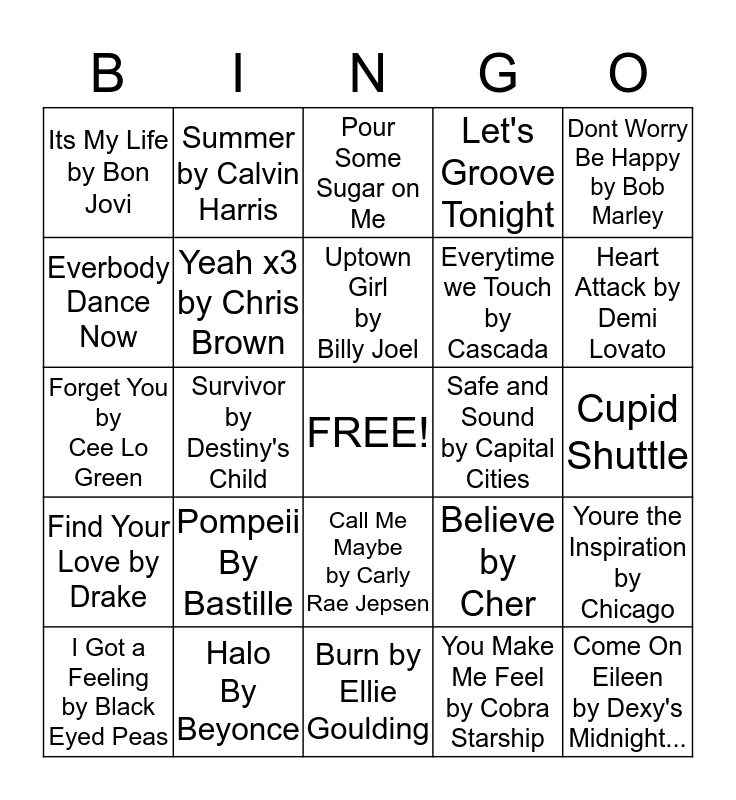This bingo card has a free space and 24 words: Pompeii By Bastille, Halo By Beyonce, Uptown Girl by Billy Joel, I Got a Feeling by Black Eyed Peas, Dont Worry Be Happy by Bob Marley, Its My Life by Bon Jovi, Everbody Dance Now, Summer by Calvin Harris, Safe and Sound by Capital Cities, Call Me Maybe by Carly Rae Jepsen, Everytime we Touch by Cascada, Forget You by Cee Lo Green, Believe by Cher, Youre the Inspiration by Chicago, Yeah x3 by Chris Brown, You Make Me Feel by Cobra Starship, Cupid Shuttle, Pour Some Sugar on Me, Heart Attack by Demi Lovato, Survivor by Destiny's Child, Come On Eileen by Dexy's Midnight..., Find Your Love by Drake, Let's Groove Tonight and Burn by Ellie Goulding.