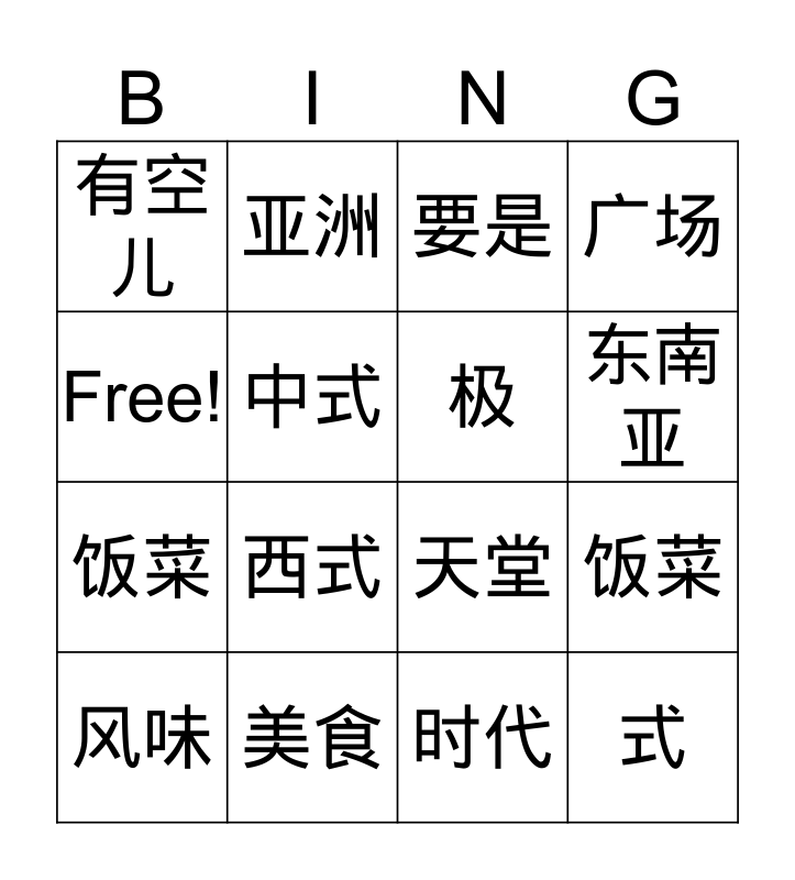 This bingo card has 16 words: 美食, 饭菜, 要是, 有空儿, 饭菜, 亚洲, 天堂, 时代, Free!, 中式, 风味, 广场, 西式, 东南亚, 极 and 式.