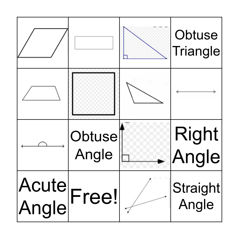 This bingo card has 17 images and 8 words: Free!, Obtuse Angle, Right Angle, Acute Angle, Acute Triangle, Straight Angle, Obtuse Triangle and Right Triangle.
