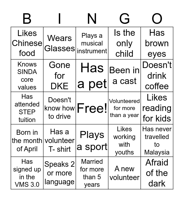 This bingo card has a free space and 24 words: Has a volunteer T- shirt, Speaks 2 or more language, Has a pet, Has signed up in the VMS 3.0, Has brown eyes, Likes Chinese food, Knows SINDA core values, Wears Glasses, Volunteered for more than a year, Plays a sport, Been in a cast, Has attended STEP tuition, Likes working with youths, Has never travelled to Malaysia, Gone for DKE, A new volunteer, Likes reading for kids, Plays a musical instrument, Doesn't drink coffee, Doesn't know how to drive, Afraid of the dark, Born in the month of April, Is the only child and Married for more than 5 years.