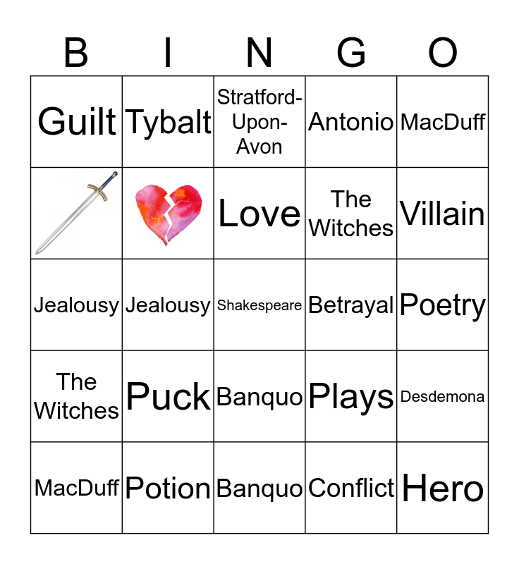 This bingo card has 4 images and 46 words: Hero, Shakespeare, Stratford-Upon-Avon, Banquo, Puck, Villain, Tybalt, Antonio, Desdemona, Plays, Poetry, Caliban, Love, Betrayal, Trust, MacDuff, Jealousy, Conflict, Guilt, The Witches, Fate, Hero, Villain, Shakespeare, Stratford-Upon-Avon, Banquo, Puck, Tybalt, Dagger, Sword, Potion, Broken Heart, Antonio, Desdemona, Plays, Poetry, Caliban, Love, Betrayal, Trust, MacDuff, Jealousy, Conflict, Guilt, The Witches and Fate.