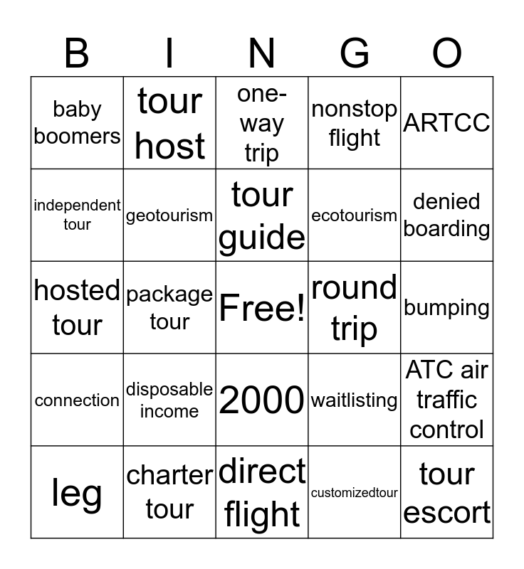 This bingo card has a free space and 24 words: disposable income, charter tour, tour guide, leg, ARTCC, baby boomers, independent tour, tour host, round trip, 2000, ecotourism, hosted tour, waitlisting, ATC air traffic control, geotourism, customizedtour, bumping, one-way trip, denied boarding, package tour, tour escort, connection, nonstop flight and direct flight.