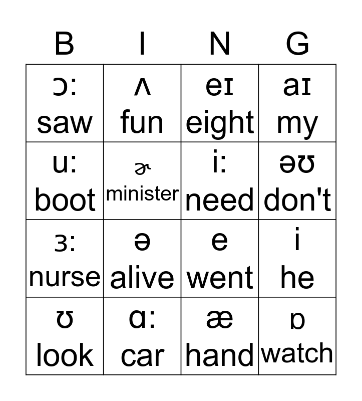 This bingo card has 19 words: e went, ɛ get, eɪ eight, ɒ watch, i he, u: boot, æ hand, ɔ: saw, ʌ fun, ɜ: nurse, ə alive, ɚ minister, i: need, ɑ: car, ʊ look, ɔɪ joy, aɪ my, əʊ don't and aʊ mouth.