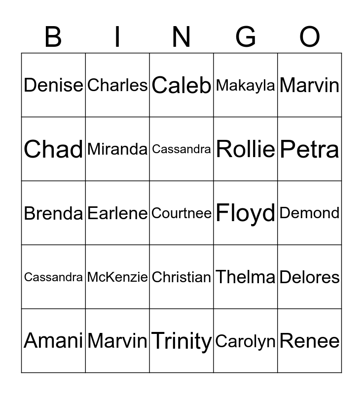 This bingo card has 25 words: McKenzie, Trinity, Cassandra, Amani, Marvin, Denise, Chad, Charles, Floyd, Christian, Rollie, Brenda, Thelma, Delores, Miranda, Renee, Demond, Caleb, Petra, Earlene, Courtnee, Marvin, Cassandra, Makayla and Carolyn.