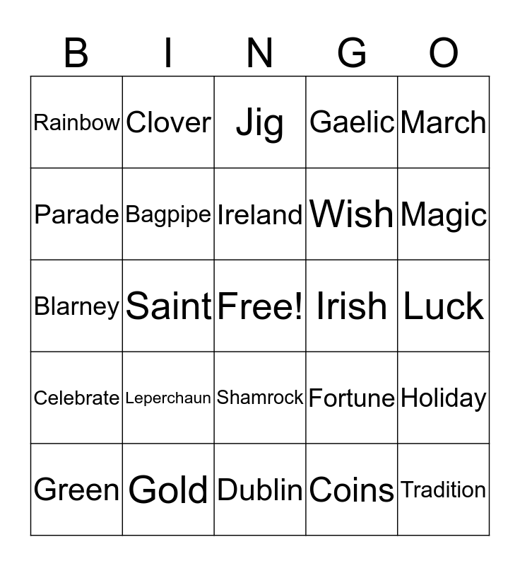 This bingo card has a free space and 24 words: Leperchaun, Gold, Ireland, Green, March, Rainbow, Parade, Clover, Irish, Shamrock, Wish, Blarney, Fortune, Holiday, Bagpipe, Coins, Luck, Jig, Magic, Saint, Tradition, Celebrate, Gaelic and Dublin.