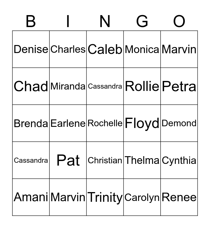 This bingo card has 25 words: Pat, Trinity, Cassandra, Amani, Marvin, Denise, Chad, Charles, Floyd, Christian, Rollie, Brenda, Thelma, Cynthia, Miranda, Renee, Demond, Caleb, Petra, Earlene, Rochelle, Marvin, Cassandra, Monica and Carolyn.