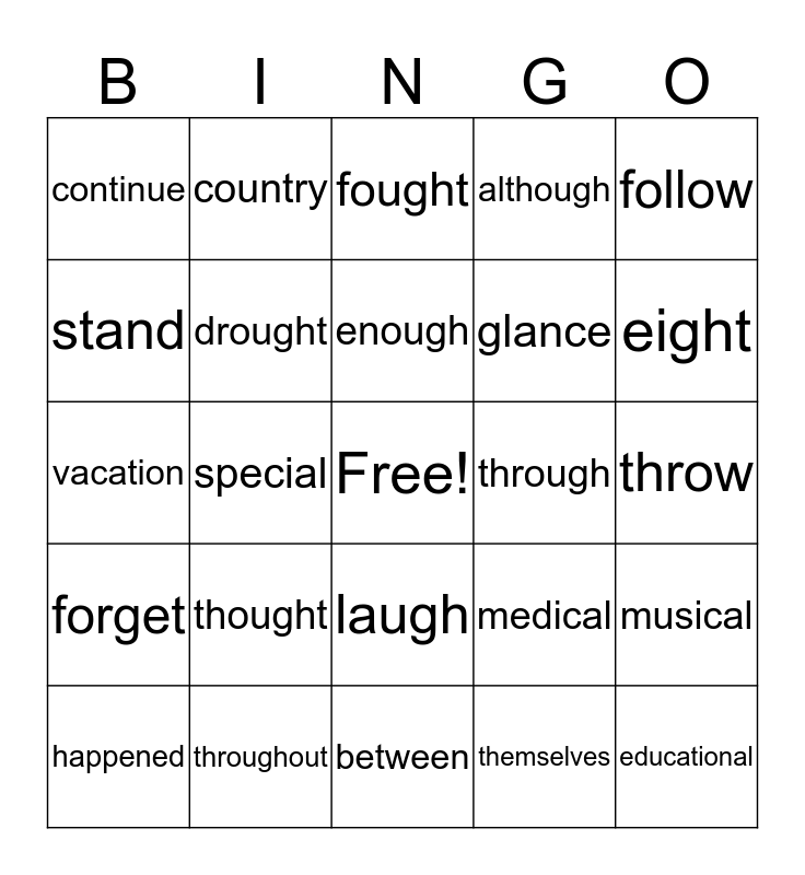 This bingo card has a free space and 29 words: happened, brought, special, extra, continue, fought, drought, thought, through, throughout, throw, educational, between, themselves, eight, carry, laugh, forget, follow, vacation, medical, fancy, glance, stand, although, country, musical, enough and mountain.