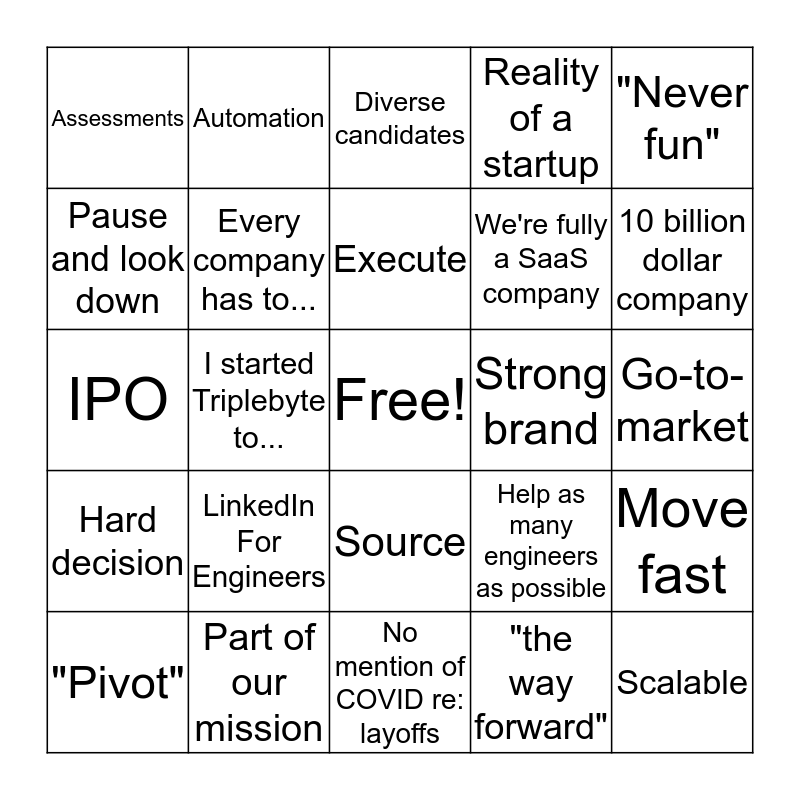 This bingo card has a free space and 24 words: LinkedIn For Engineers, Part of our mission, Execute, "Pivot", "Never fun", Assessments, Pause and look down, Automation, Strong brand, Source, We're fully a SaaS company, IPO, Help as many engineers as possible, Move fast, Every company has to..., "the way forward", Go-to-market, Diverse candidates, 10 billion dollar company, I started Triplebyte to..., Scalable, Hard decision, Reality of a startup and No mention of COVID re: layoffs.