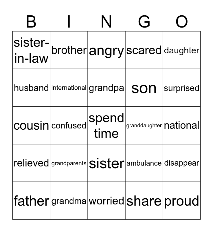 This bingo card has a free space and 24 words: grandparents, grandma, grandpa, father, daughter, sister-in-law, husband, brother, granddaughter, sister, son, cousin, ambulance, disappear, international, share, national, angry, surprised, confused, proud, relieved, scared and worried.
